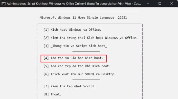 Hành động 4: Bấm phím 4 để thiết lập tác vụ tự động gia hạn bản quyền cho hệ điều hành và bộ Office.