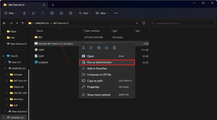 Khi sử dụng Tool, bạn cần mở file “Activate AIO Tools by Savio.cmd” bằng quyền quản trị viên — bấm chuột phải chọn Run as Administrator để tránh lỗi trong quá trình kích hoạt.