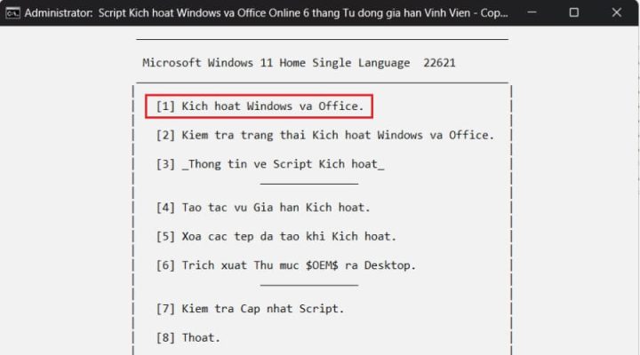 Hành động 1: Nhấn phím 1 để bắt đầu kích hoạt Windows và Office 365.