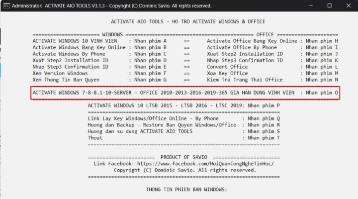 Bước 3: Khi giao diện chính của phần mềm xuất hiện, nhấn phím O để bắt đầu kích hoạt bản quyền Windows và Office tự động.