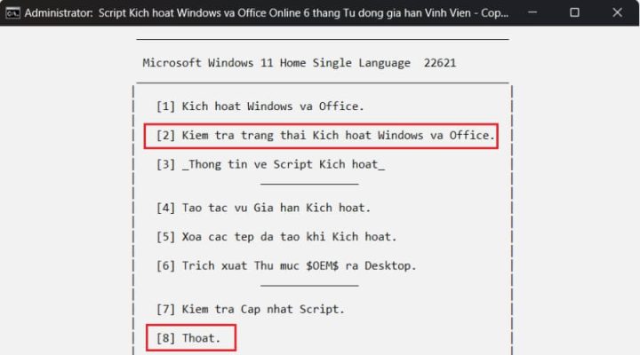 Trong phần menu, hai mục [A] ACTIVATE WINDOWS 10 BẢN QUYỀN SỐ và [O] ACTIVATE WINDOWS 7-8-8.1-10-SERVER/OFFICE 2010-2013-2016-2019-365 GIA HẠN VĨNH VIỄN đều có hướng dẫn chi tiết tại mục “Thông Tin Script Kích Hoạt”, bạn nên đọc kỹ trước khi thao tác.