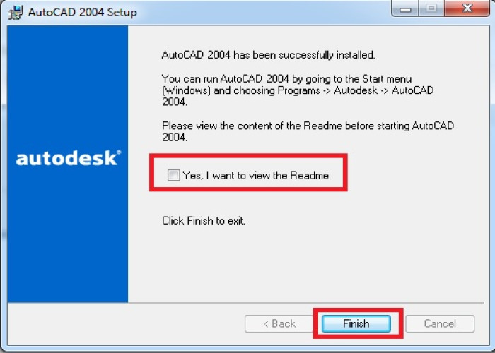 - Sau khi cài đặt xong các bạn bỏ tích chọn Yes, I want to view the Readme và nhấn Finish để kết thúc quá trình cài đặt Autocad 2004.