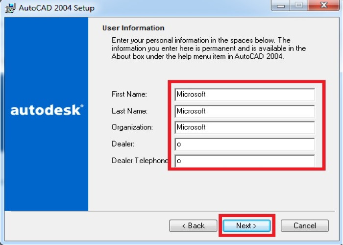 Bước 5: Hiện ra bảng nhập thông tin cá nhân vào autocad các bạn để nguyên hoặc điền thông tin các nhân của các bạn vào và nhấn Next để tiếp tục