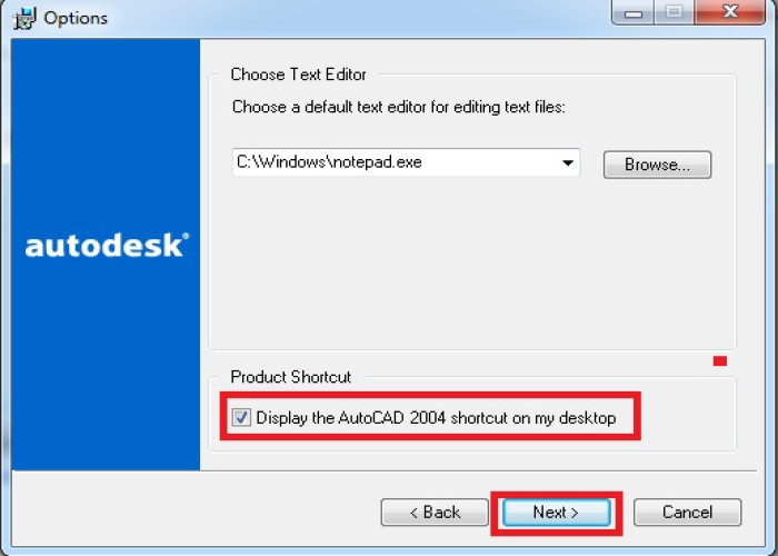 Bước 8: Ở đây các bạn tích chọn Display the Autocad 2004 Shorcut on my desktop để hiển thị ra màn hình chính máy tính nhé, và nhấn Next để tiếp tục
