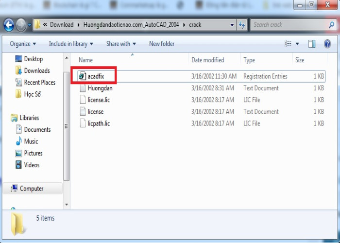 Bước 1: Sau khi cài đặt xong các bạn quay lại file tải lúc nãy mở Folder Crack lên và chạy file “acadfix“(click chuột phải chọn Merge)