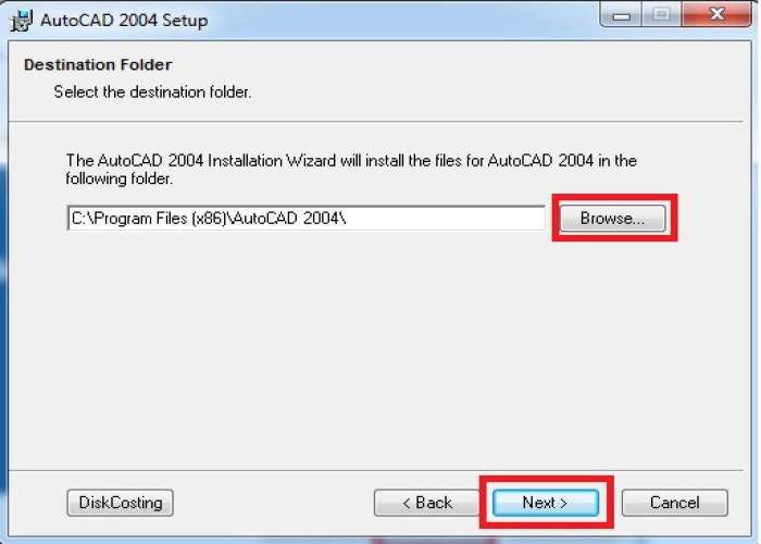 Bước 7: Chọn đường dẫn cài đặt phần mềm Autocad 2004 (nên để mặc định) và nhấn Next để tiếp tục